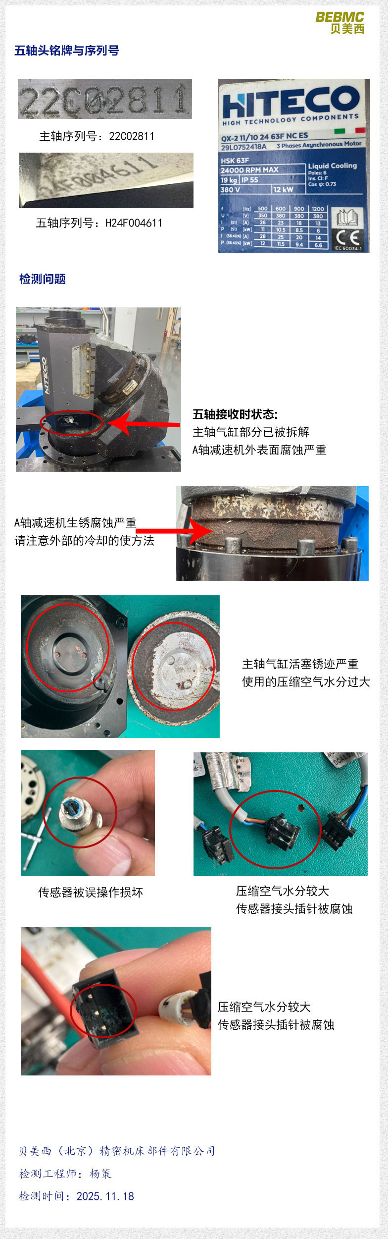 主軸未經(jīng)許可私自拆解,非產(chǎn)品品質(zhì)問題,主軸內(nèi)部氣缸銹跡嚴重,使用的壓縮空氣含水量太大,造成傳感器連接器插針腐蝕短路。